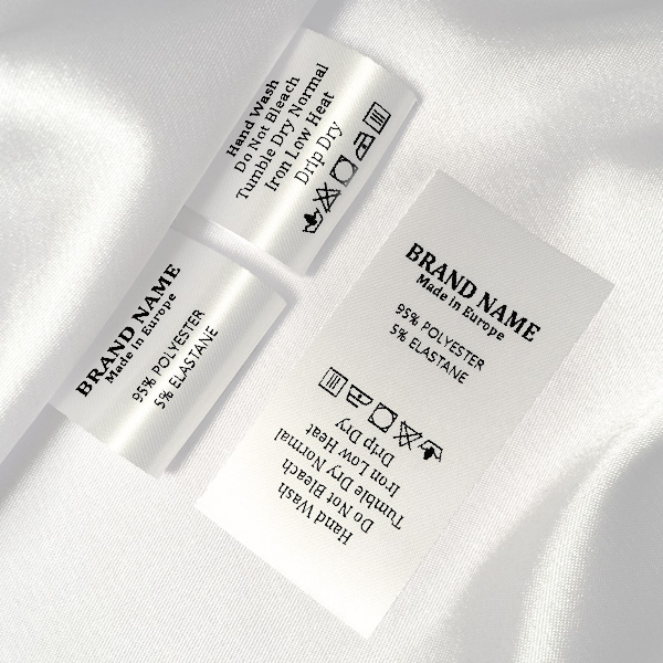 Benutzerdefiniertes Etikett TC-M30 gedruckt auf satiniertem Textil, geeignet für Kleidung und verschiedene Kleidungsstücke.