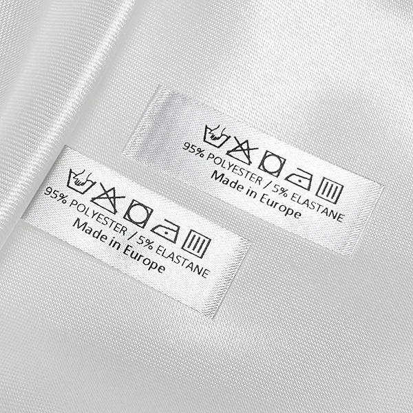 Das Textiletikett mit Wasch- und Pflegesymbolen zum Aufnähen auf die Kleidung, personalisiert mit den Angaben zur Materialzusammensetzung und zum Herstellungsland. Dieses Modell eines Textiletiketts wird mit den modernsten Technologien im Bereich des Digitaldrucks auf Textilmedien hergestellt. Die Etiketten werden im Thermotransfer-Verfahren auf Spezialsatin gedruckt, das sich durch eine beeindruckende Druckqualität und hohe Waschbeständigkeit auszeichnet. Die gedruckten Etiketten werden automatisch entsprechend den angegebenen Maßen geschnitten.